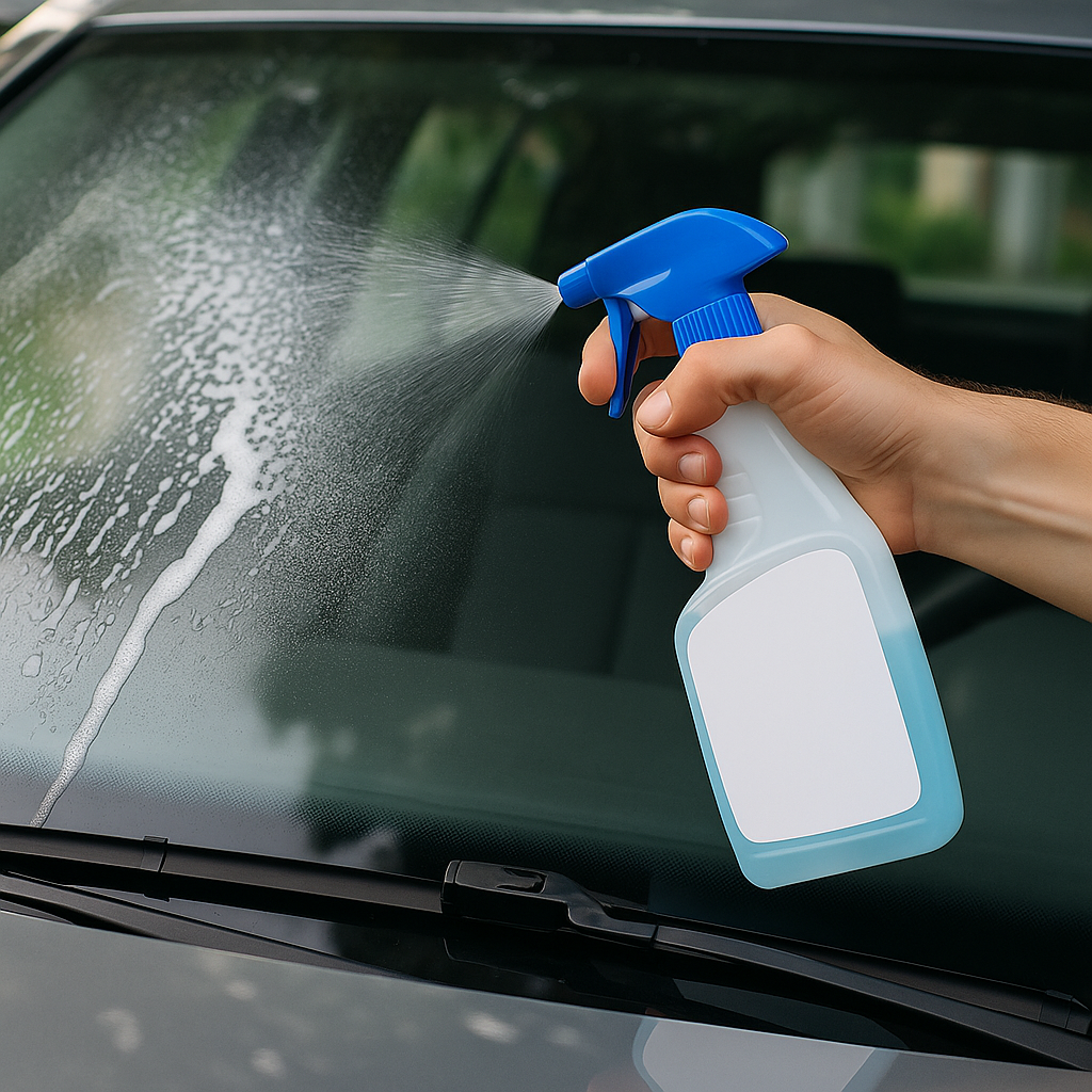 먼저 자동차 유리를 물로 충분히 헹궈 먼지를 제거합니다. 거친 입자가 유리를 긁을 수 있기 때문이에요. - 2단계: 유막 제거제 도포