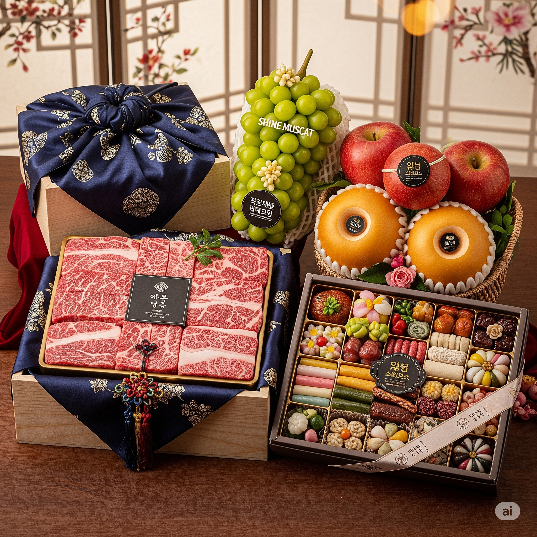 명절 선물 과일의 대명사인 사과, 배를 넘어 특별함을 더하고 싶다면 샤인머스캣, 애플망고, 멜론 등이 포함된 프리미엄 혼합 과일 세트를 추천합니다. 시각적인 만족감과 맛을 동시에 잡을 수 있습니다. - 한과 / 육포 등 고급 전통 간식 세트