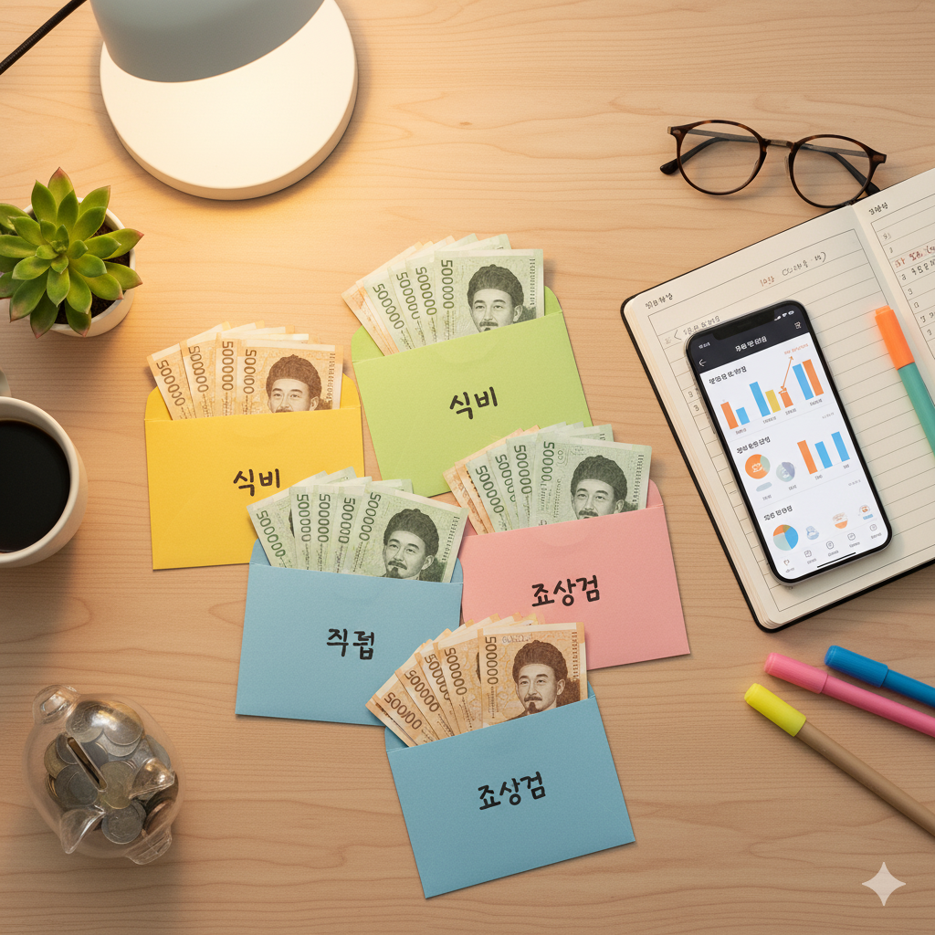 - 항목별로 돈 나누기: 인출한 돈을 '식비(10만원)', '취미/문화(5만원)', '비상금(5만원)' 등 자신만의 카테고리로 나누어 각 봉투에 담습니다. 이제부터 해당 항목의 지출은 무조건 이 봉투 안의 현금으로만 해결하는 겁니다.