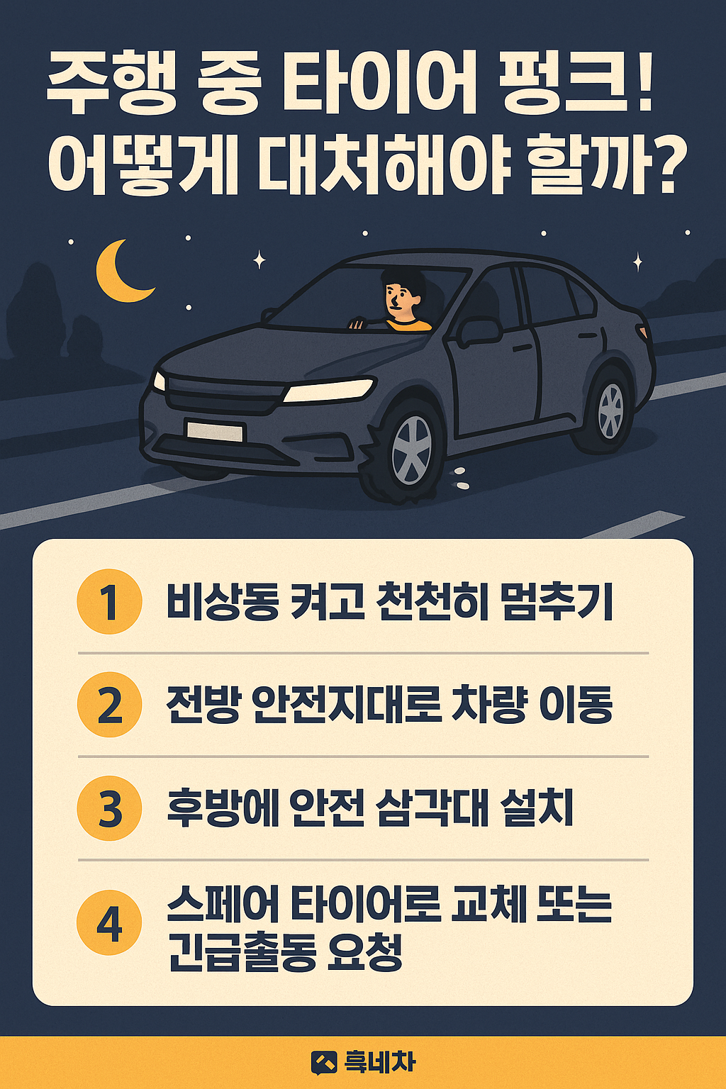 운전 중 갑자기 ‘쿵!’ 소리와 함께 핸들이 흔들리고 차가 쏠린다면, 타이어 펑크일 가능성이 높습니다. 이런 상황은 누구에게나 갑작스럽고 위험할 수 있습니다. 특히 고속도로 또는 야간 주행 중 타이어가 터졌을 때는 당황하지 말고 아래 순서대로 침착하게 대응하는 것이 중요합니다.