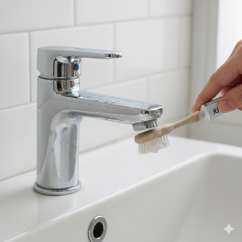 구연산으로 물때를 녹였다면, 이제 광택을 낼 차례입니다. 치약에는 미세한 연마제 성분이 들어있어 수전의 묵은 때를 벗겨내고 반짝이는 광을 내는 데 최고입니다.