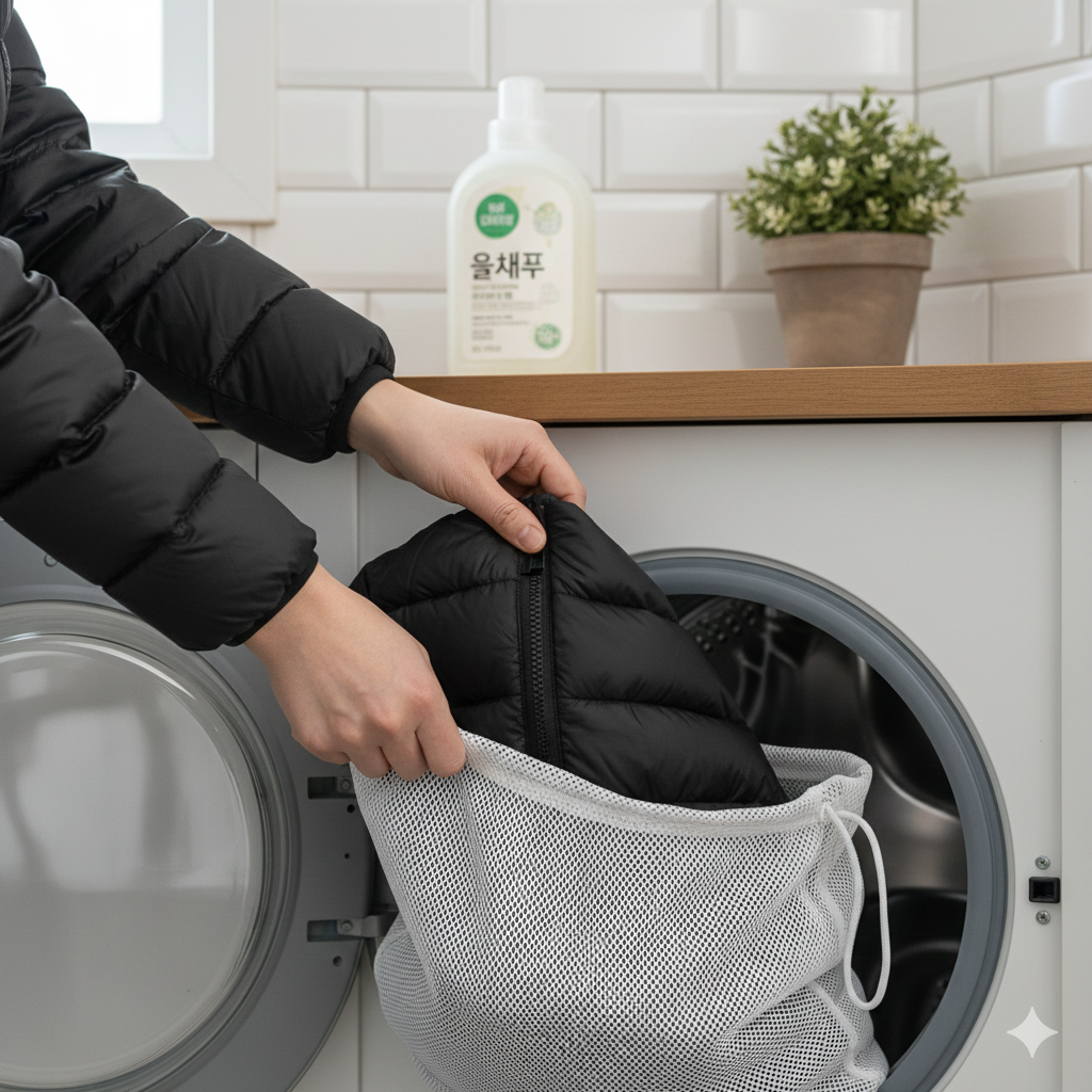 Tip: 섬유유연제는 절대 금지! 패딩의 방수 코팅을 녹이고 털의 복원력을 떨어뜨립니다. 헹굼 단계에서 냄새를 잡고 싶다면 '구연산'을 조금 넣어주세요.