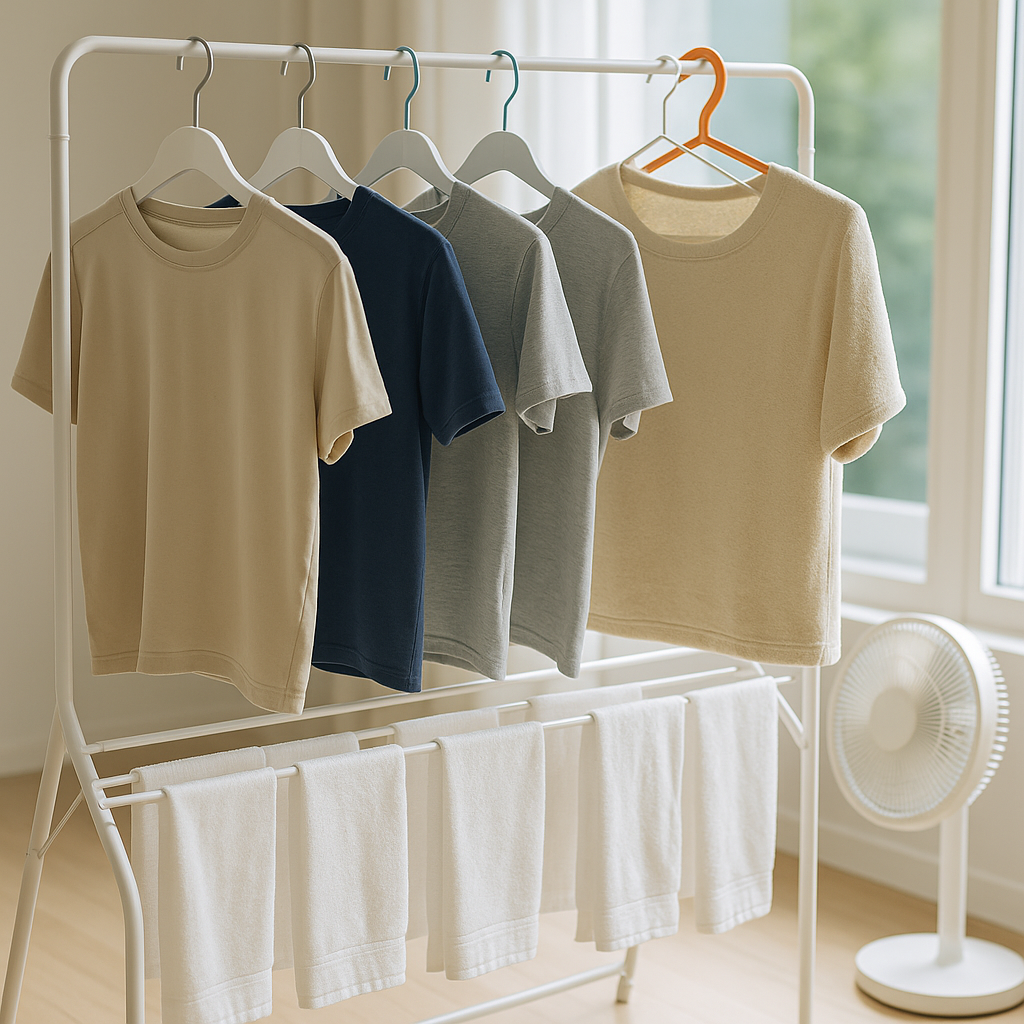 실내에서 빨래를 말릴 때 가장 중요한 건 ‘공기의 흐름’입니다. 선풍기나 써큘레이터를 빨래 방향으로 고정해 두고, 창문을 살짝 열거나 환기팬을 돌려 공기의 순환을 만들어주세요. 여기에 제습기가 있다면 금상첨화! 제습 모드로 3시간만 돌려도 빨래가 반쯤 마릅니다. 장마철에는 선풍기 + 제습기 조합이 진리예요.